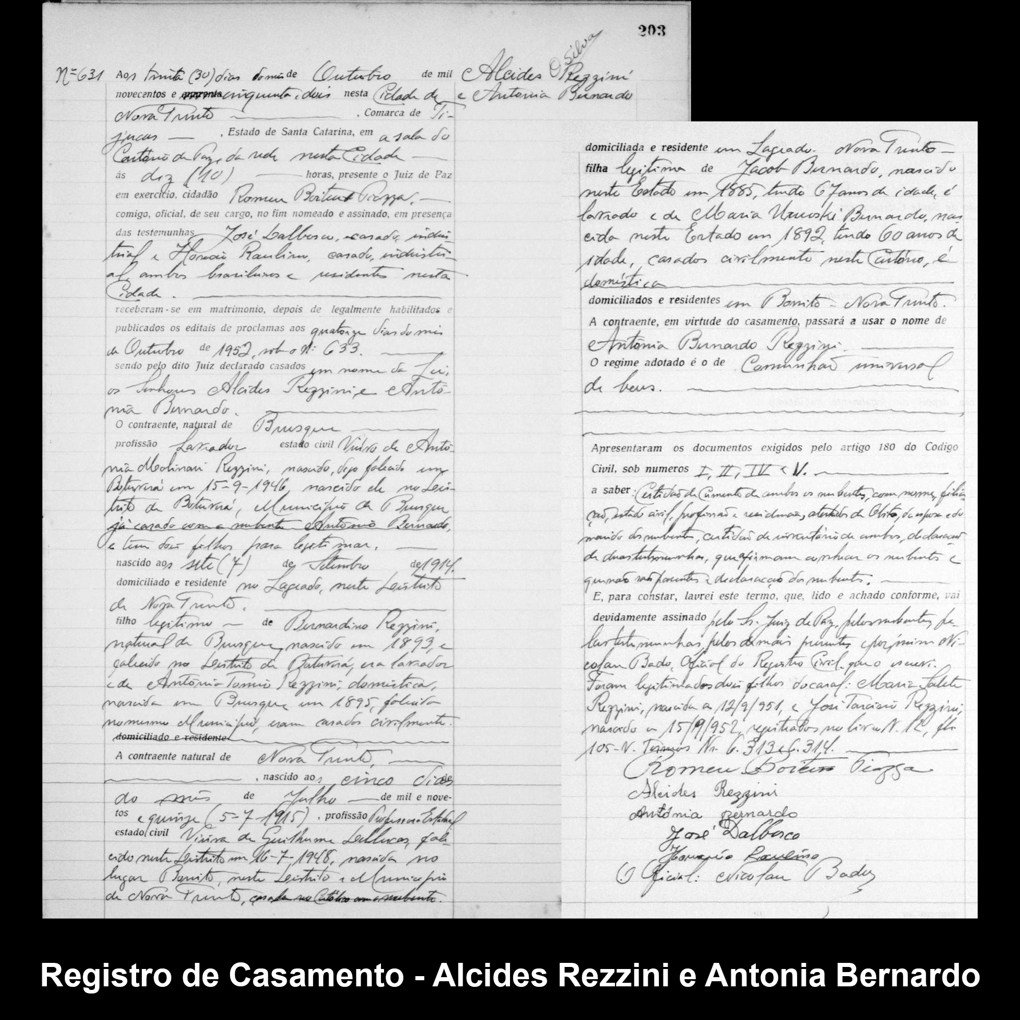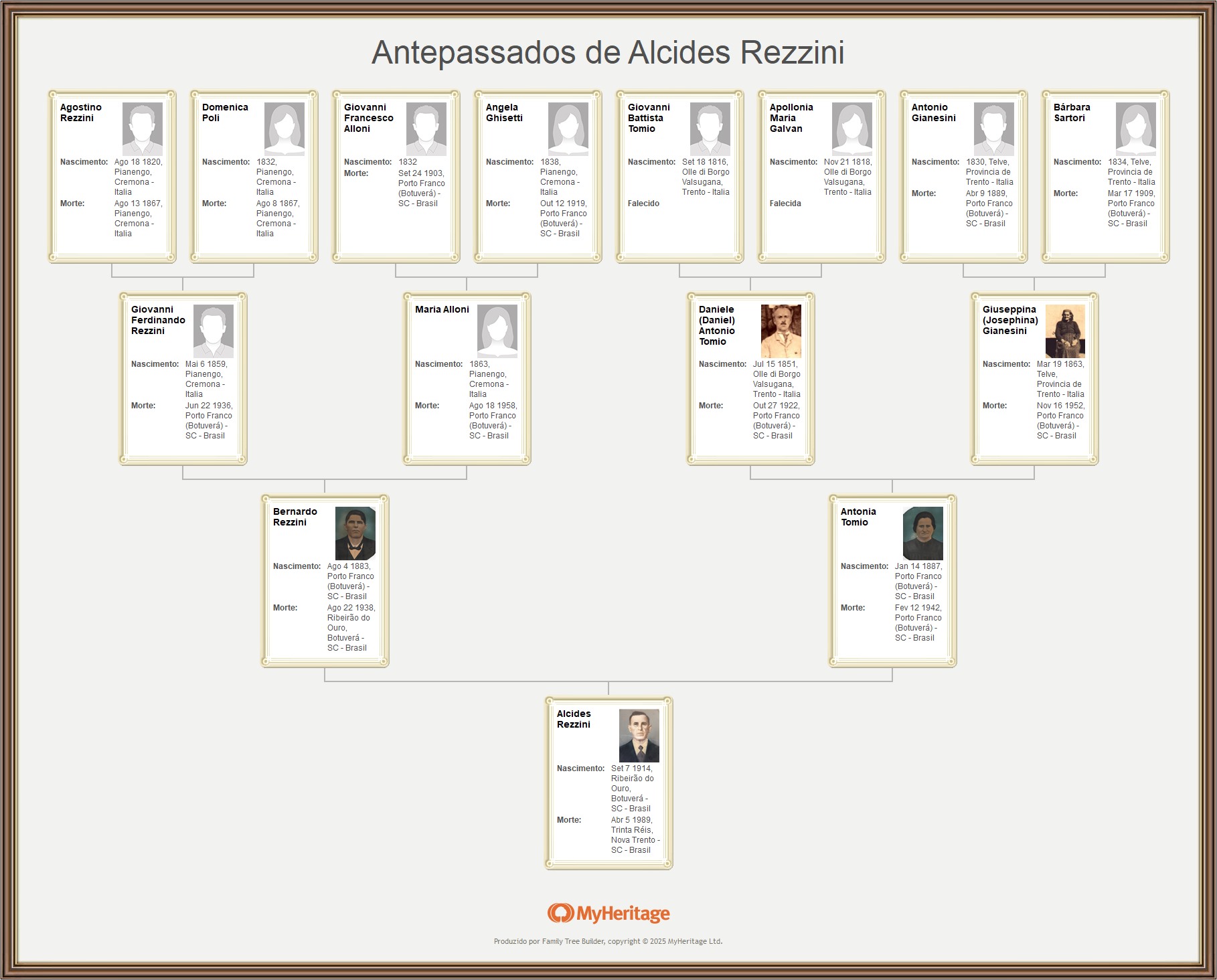 Alcides Rezzini nasceu em 7 de setembro de 1914, na localidade de Porto Franco, nome original do atual município de Botuverá, em Santa Catarina. Filho de Bernardo Rezzini e Antonia Tomio, cresceu em meio à vida rural e às tradições de sua comunidade, herdando de seus pais os valores do trabalho árduo, da fé e da família.